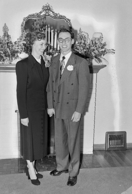 A newlywed couple standing together in front of a fireplace within a home.