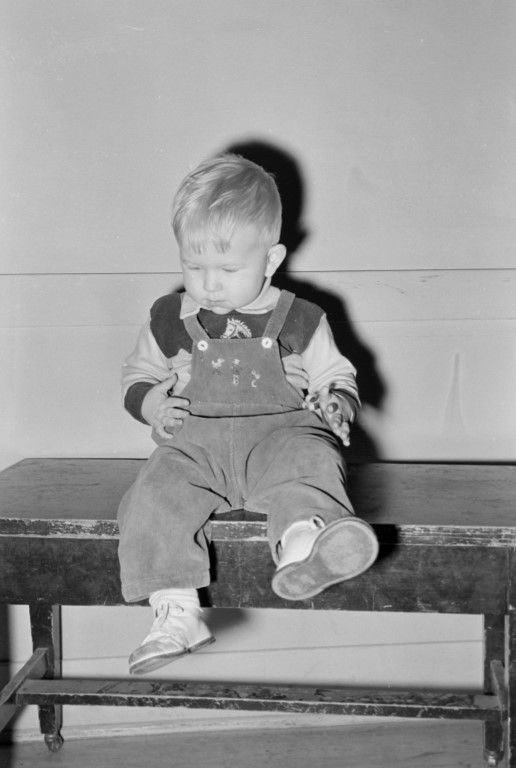 A toddler boy in overalls sitting on a bench.