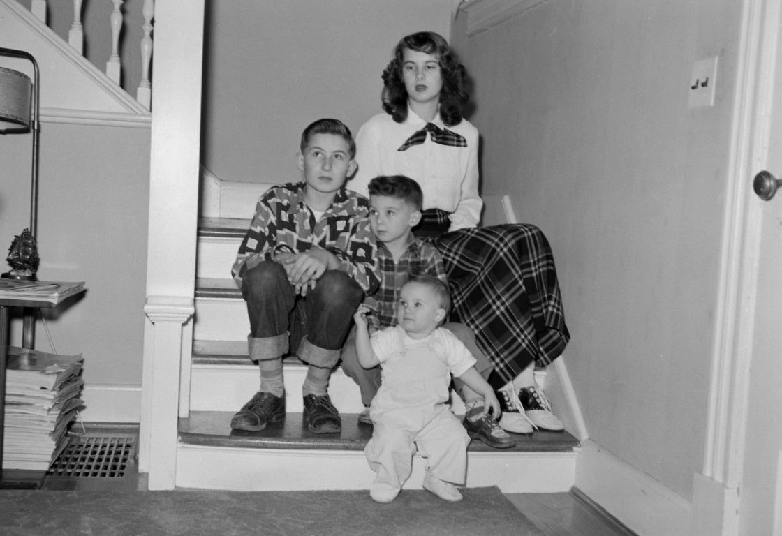 Four people sitting on stairs, a young woman in plaid skirt and saddle shoes, a young man, a little boy, and a toddler.