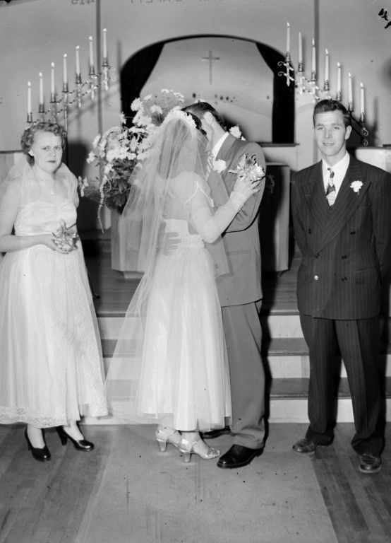 The bride and groom kiss in front of the sanctuary and are flanked by the Maid-of-Honor and the Best Man.