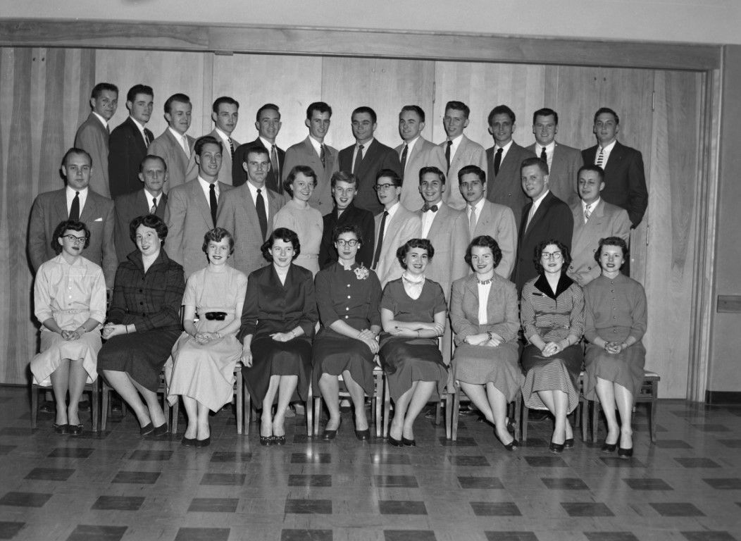 A large group of well-dressed men and women posing for a photo in an indescript room.