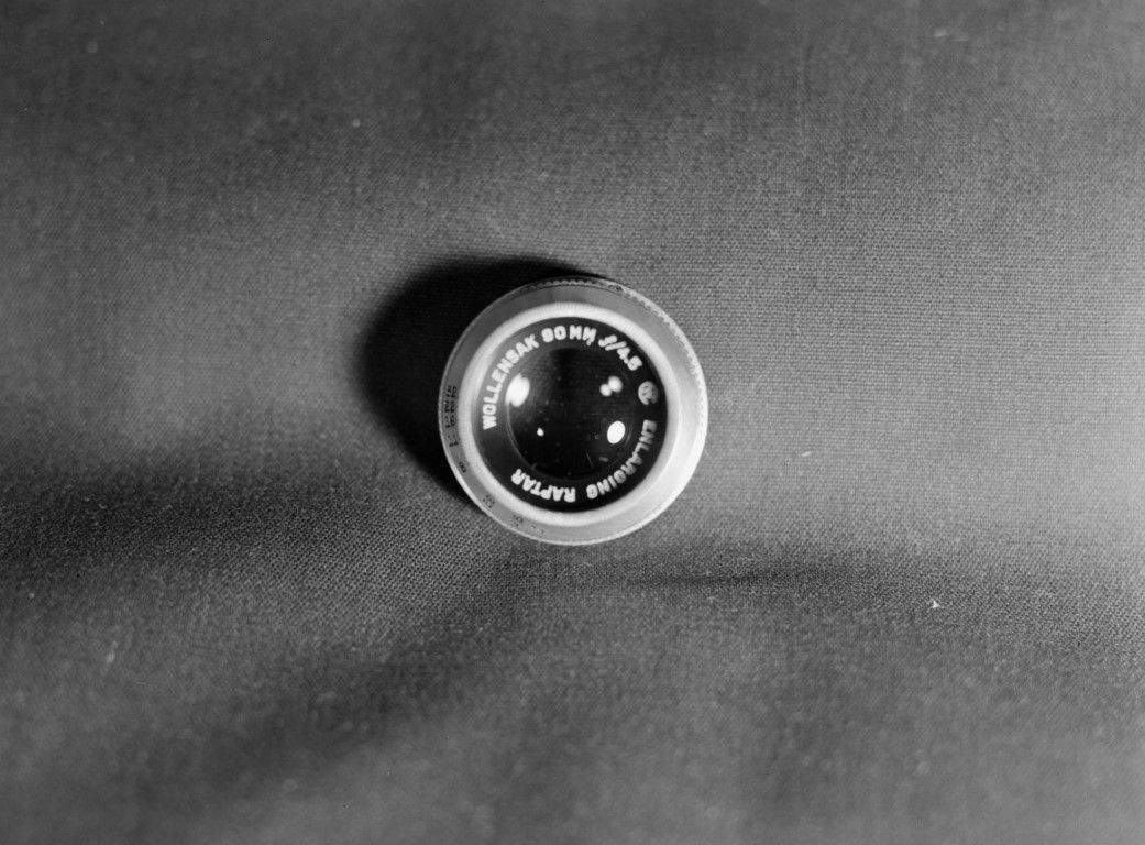 A close-up of a camera lens. The lens reads "Wollensak 90 MM Enlarging Raptar."