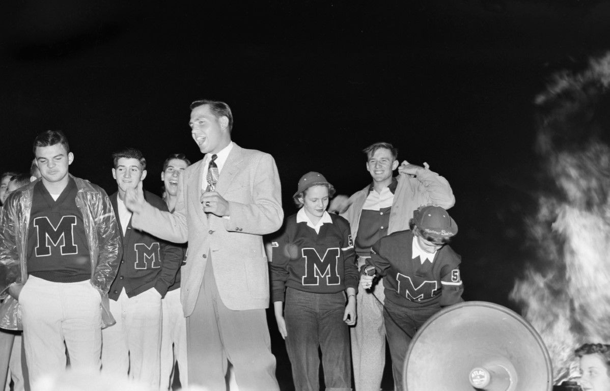 Students in Letterman sweaters and a man in a suit, who is speaking, standing near a bonfire.
