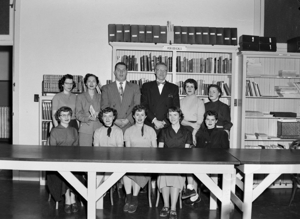 A group photo of what is presumably library staff posing in front of the periodicals shelves.