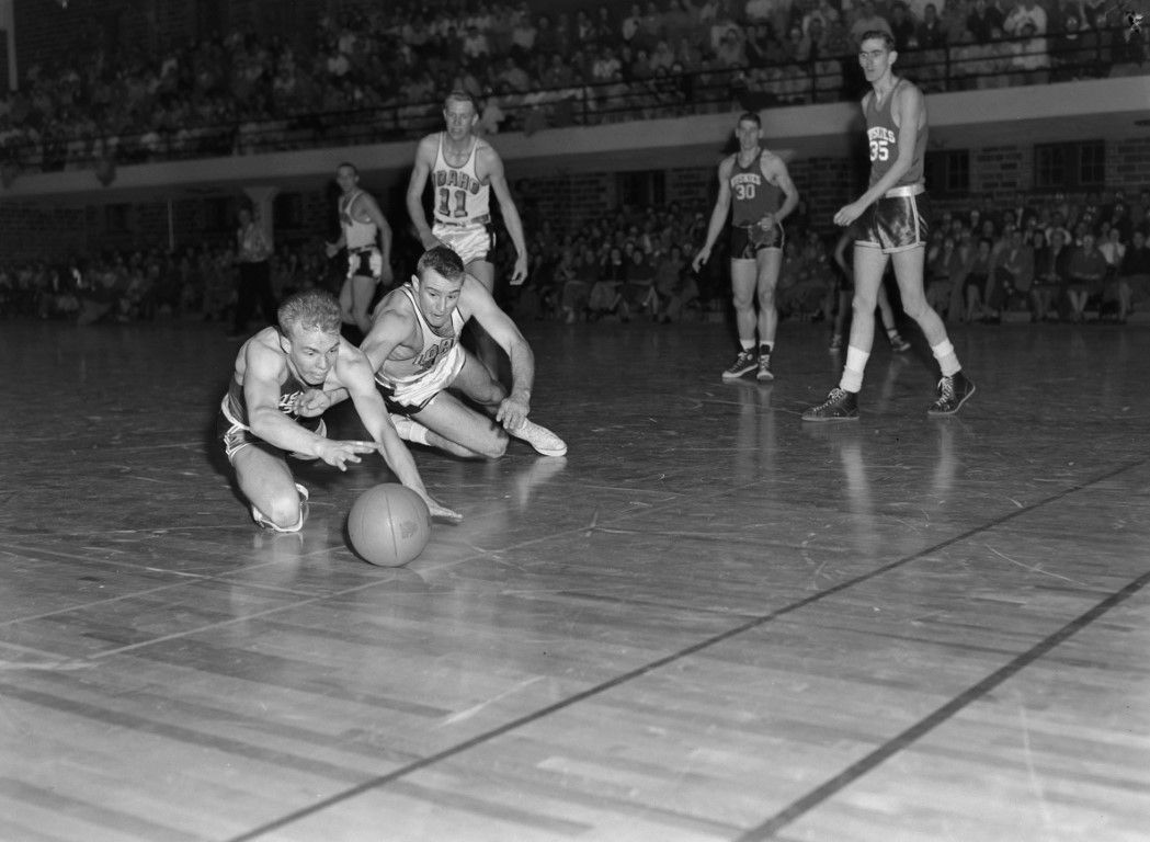 Members of the University of Washington and University of Idaho basketball teams scramble for a loose ball on the court.