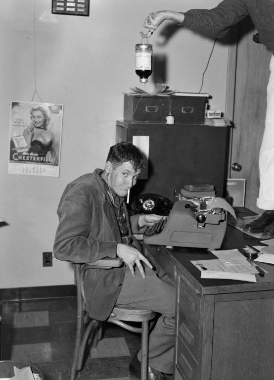 A young man in character sitting at desk with a typewriter. There is another person standing on the desk to create the appearance of an IV drop. Behind the man is a Chesterfield calendar with a woman on it.