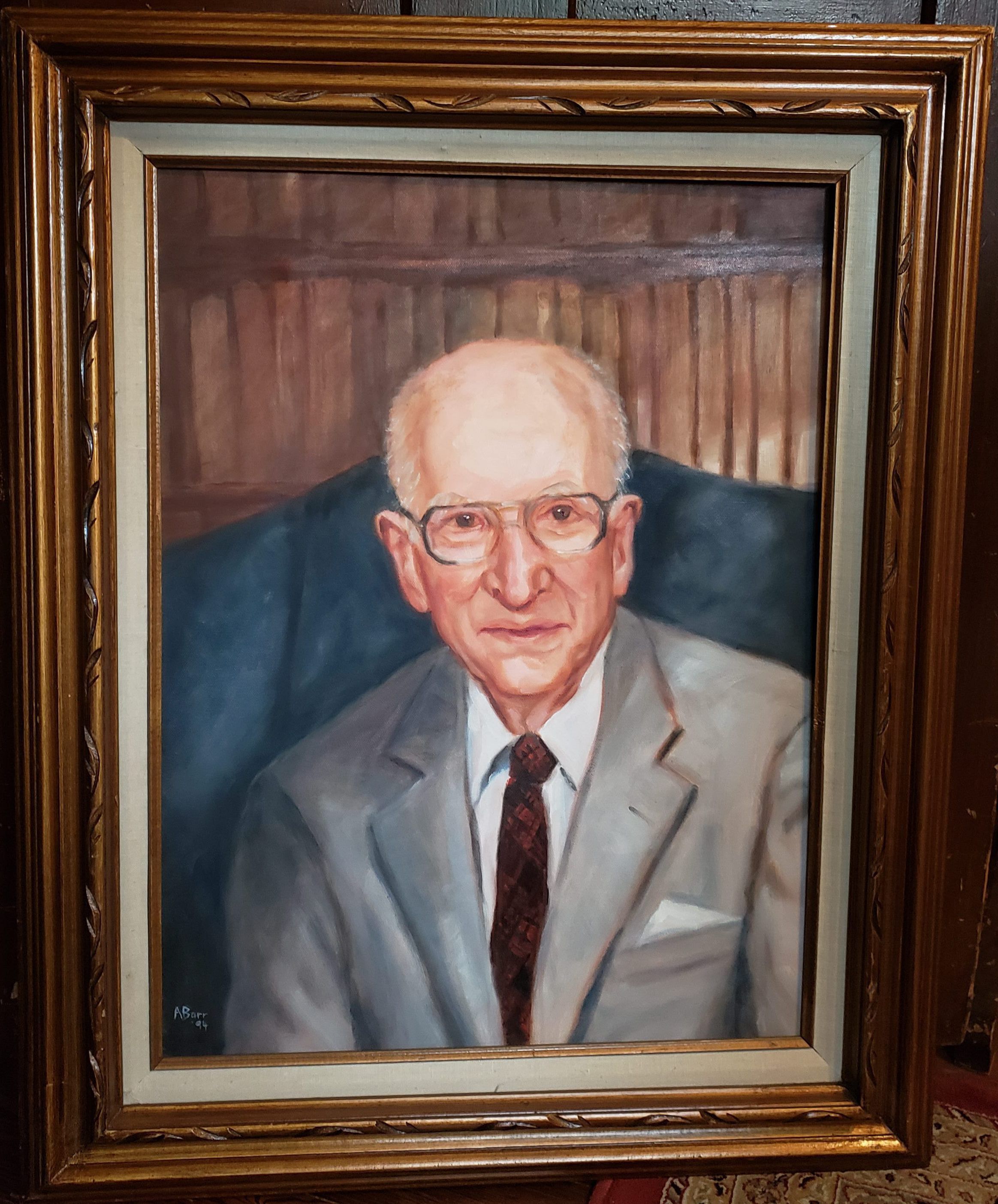 .1 oil painting, framed, portrait of Malcolm Renfrew by Audrey Barr .2 placard describing life of Mr. Renfrew, for exhibit purposes
