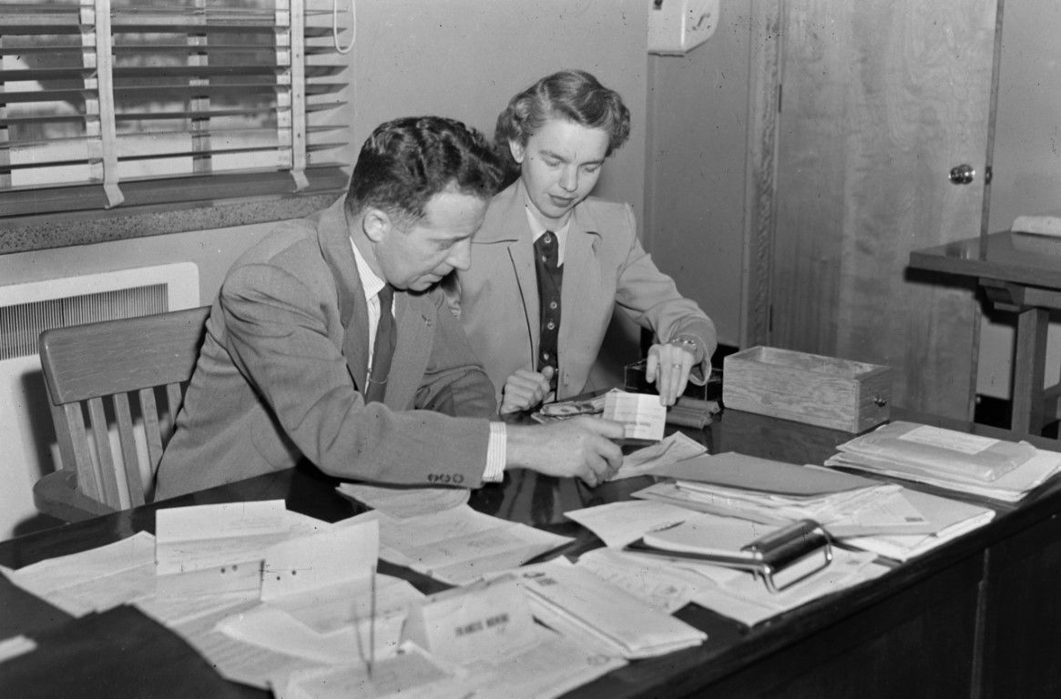 A man and a woman in business suits sitting at a desk looking at some papers and money.