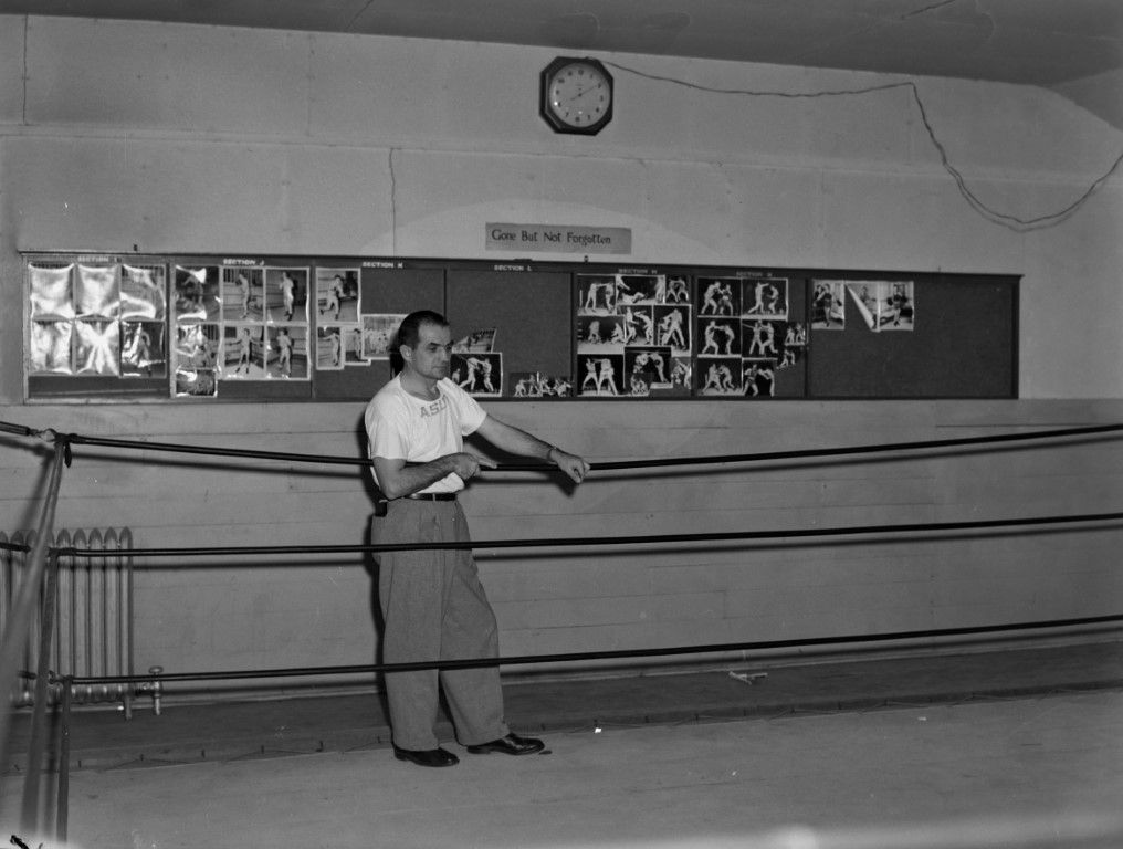 A man stands at the ropes of a boxing ring wearing an ASUI tshirt and slacks. Bulletin boards on the wall behind him displays pictures of boxers with a sign above that says "Gone But Not Forgotten."