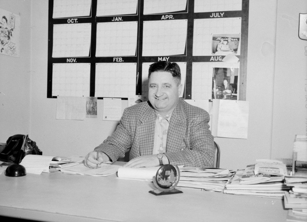 A man sitting at a desk covered in papers, a large monthly calendar on the wall behind him