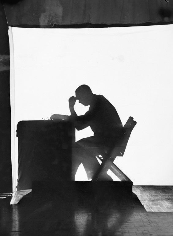A silhouette of a man sitting and thinking at his desk.