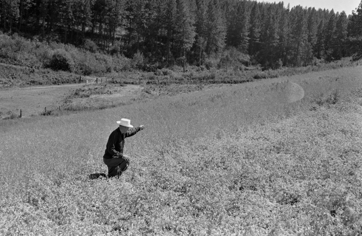 A man in a white hat kneeling in a farm field, pointing into the distance, trees and fenceline in the background