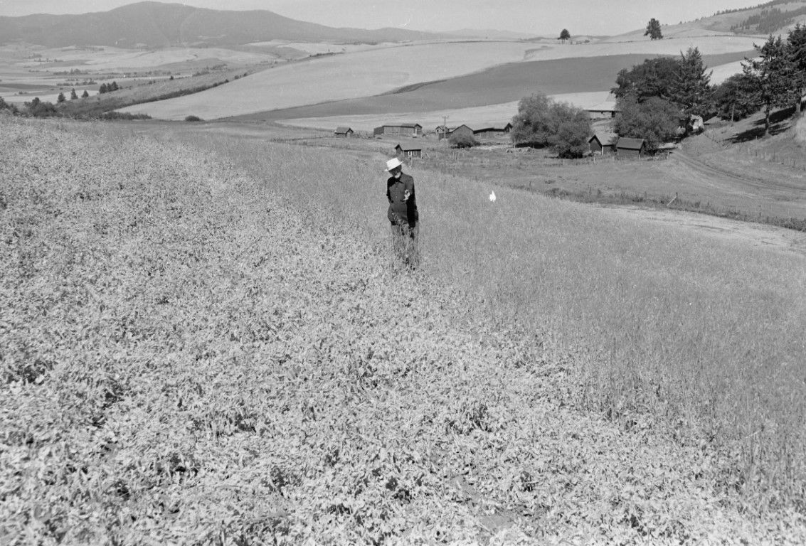 A man in a white hat, Bill Jones, stands in the middle of a farm field. Buildings and trees behind him, possibly Moscow Mountain in the distance.