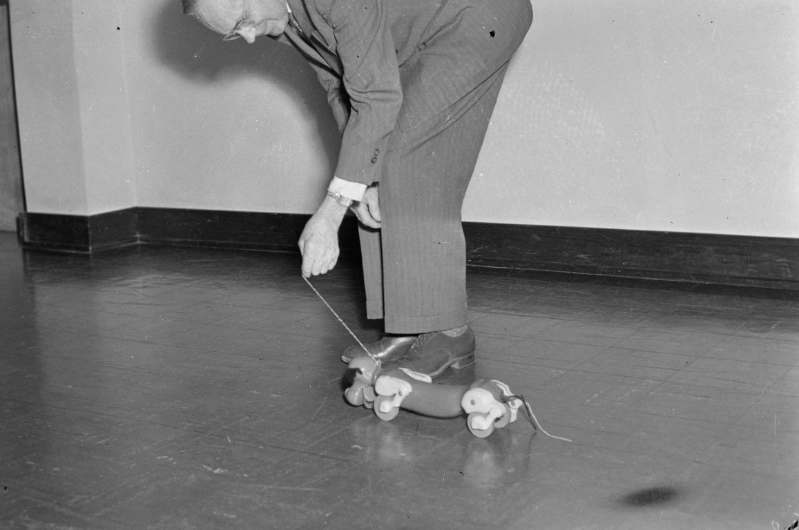 A man in a suit is pulling the leash of a wheeled toy dog along the floor.