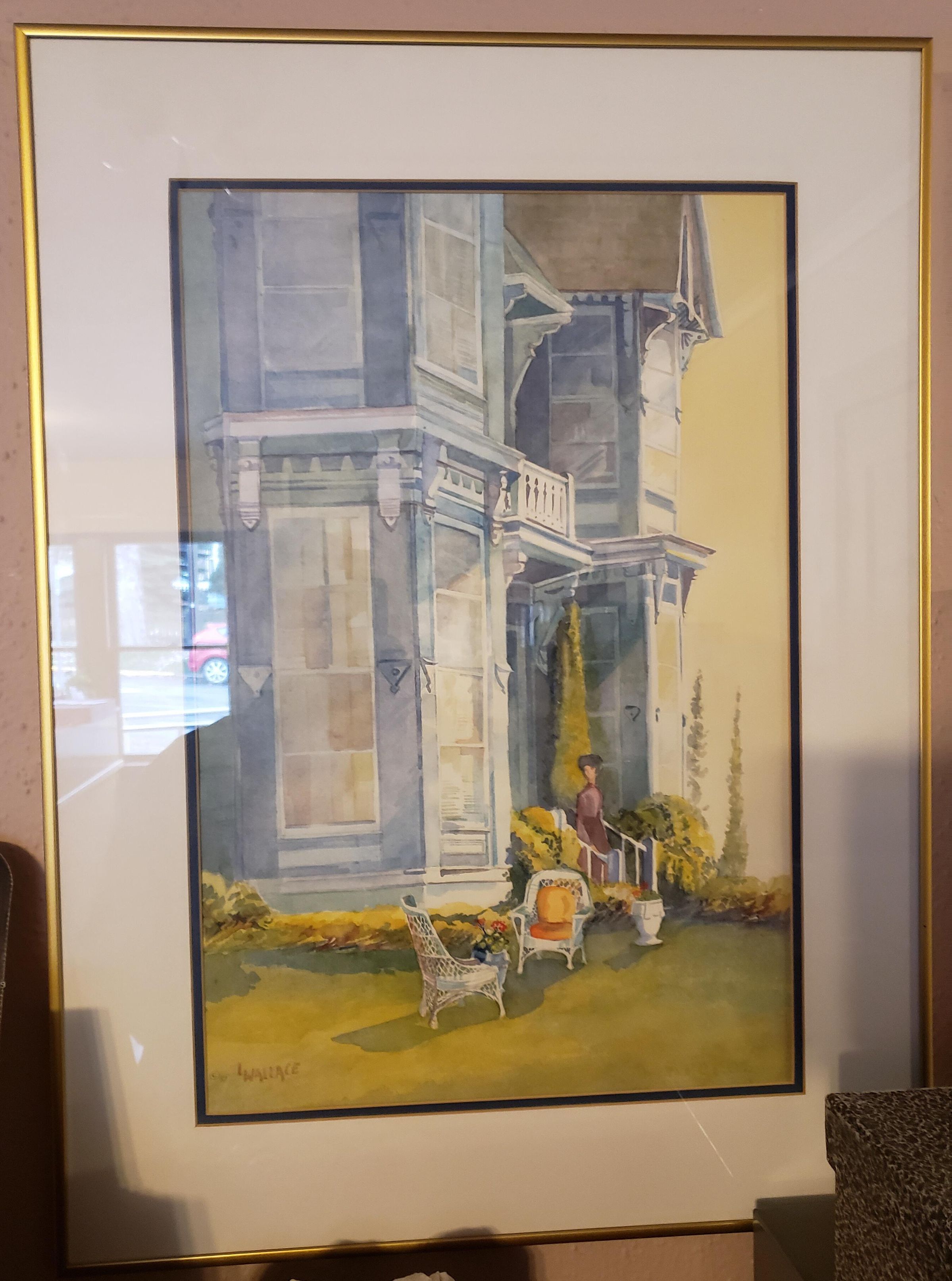 Watercolor painting of a woman outside of the McConnell Mansion by Linda Wallace. Matted in a gold frame.