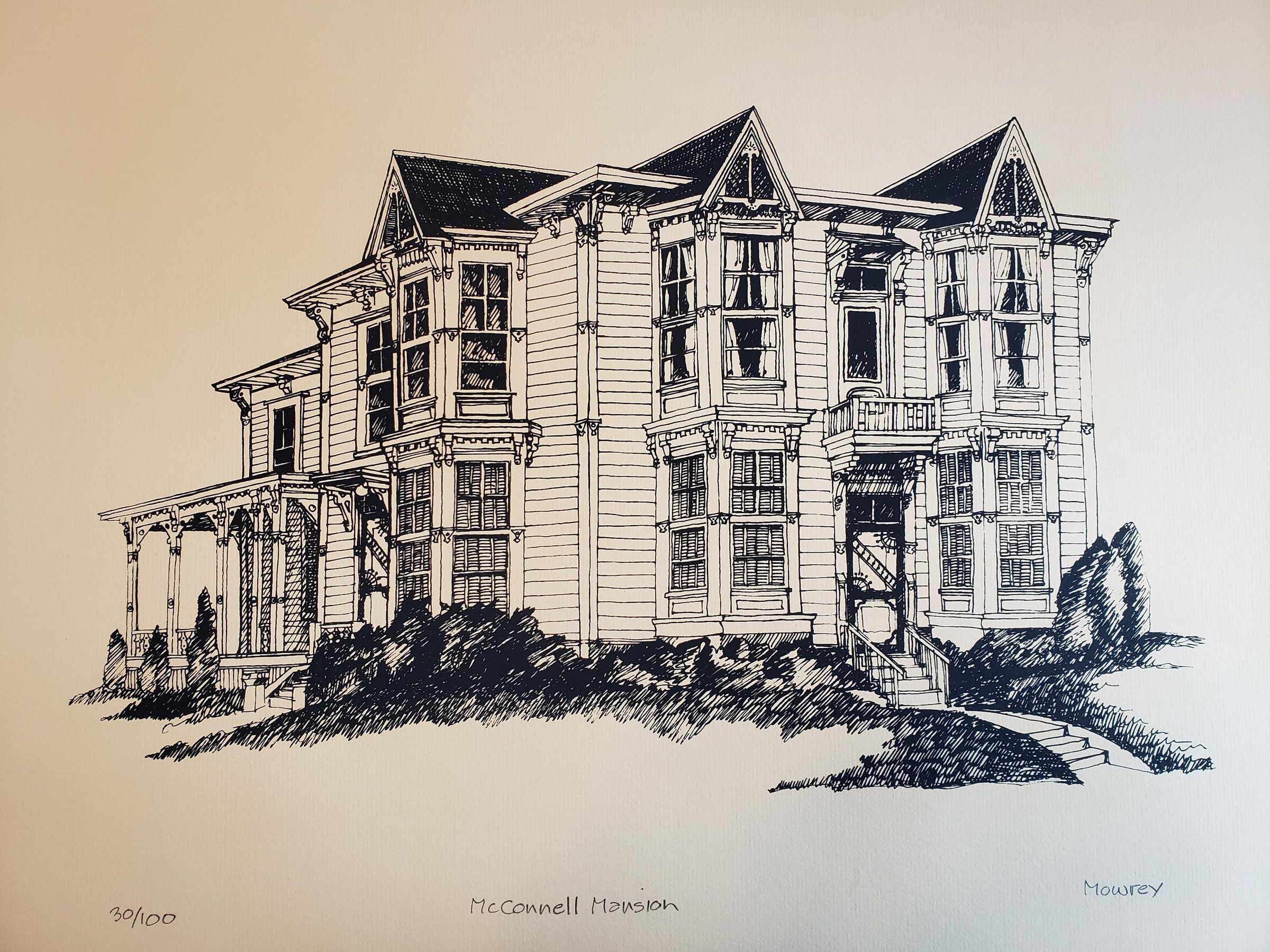 2 copies of line drawing prints of the McConnell Mansion by artist Liz Mowrey. 51 and 30 of 100 prints.