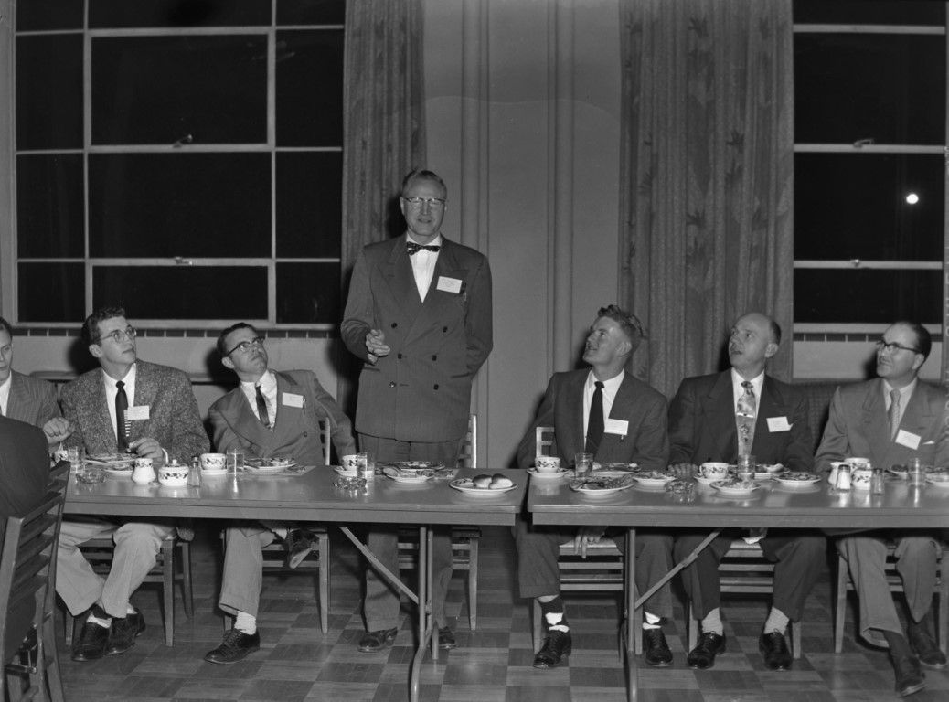 Men in suits seated at a banquet table are looking at a man in the center who is standing and speaking.