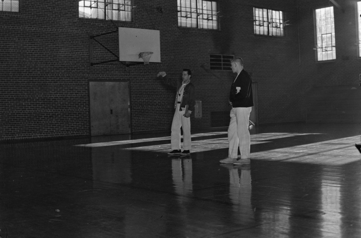 Two men in street clothes, one with a whistle, standing on a basketball court. Moscow High School gymnasium