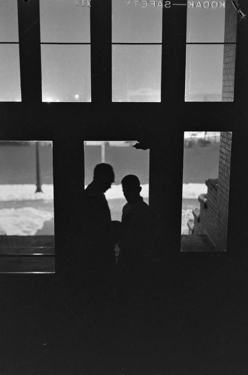 Two men standing at the window of a door in the entrance of a building.