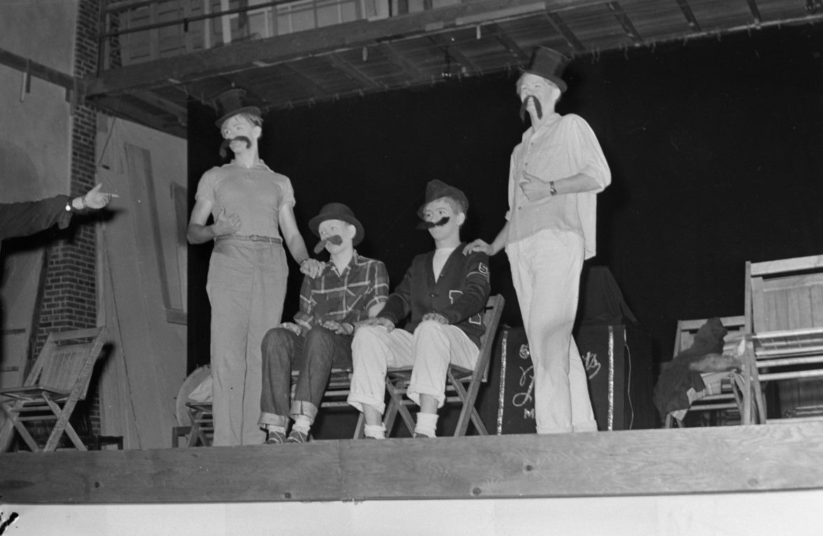 Young actors sitting in chairs on a stage wearing fake mustaches.