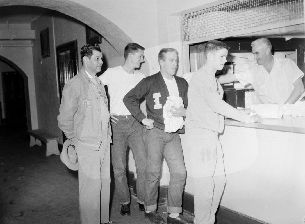 A group of young men standing in line at a counter, possibly to receive food.