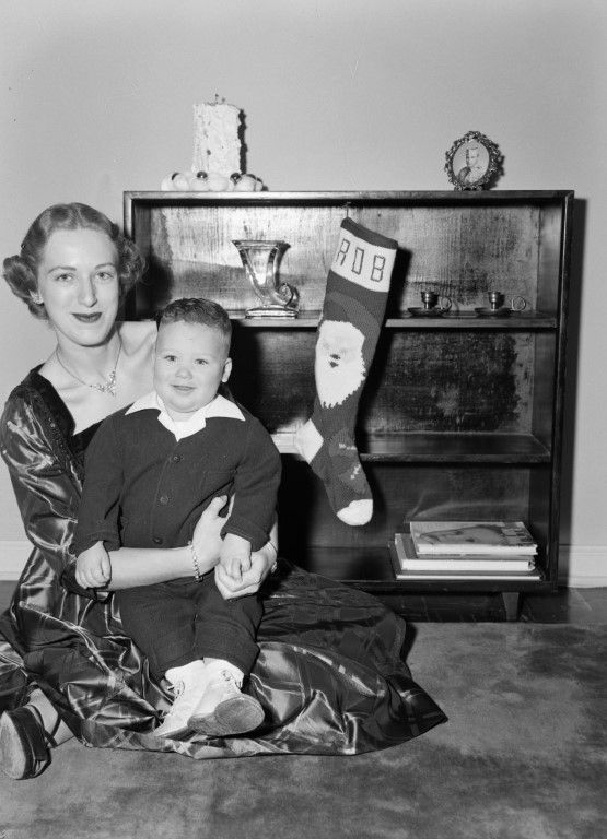 A woman in a Christmas dress sits on the floor with a toddler boy in a suit. A Christmas stocking with the name "Rob" and a picture of Santa Claus hangs on the bookcase. (same people as 1345)