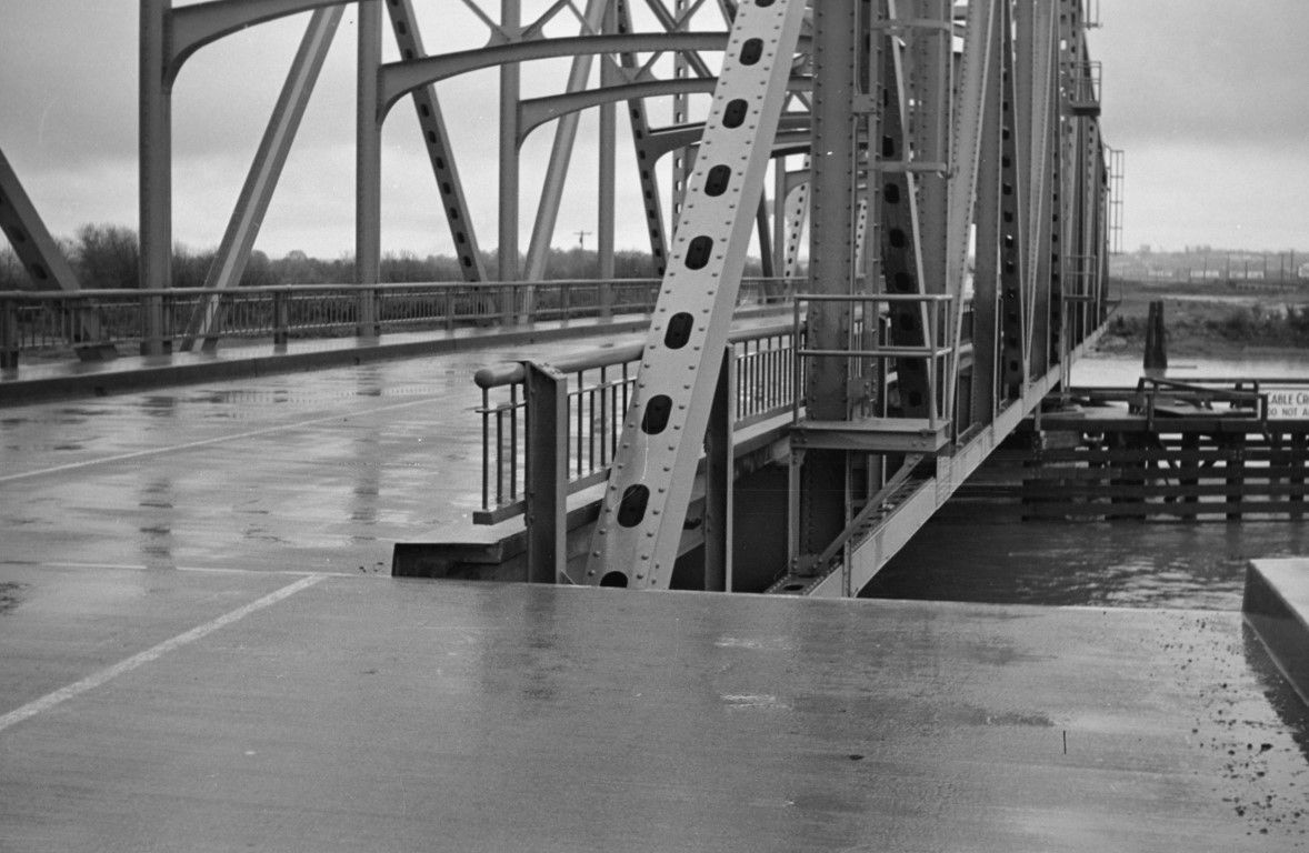 A low steel highway bridge crossing a creek or river.