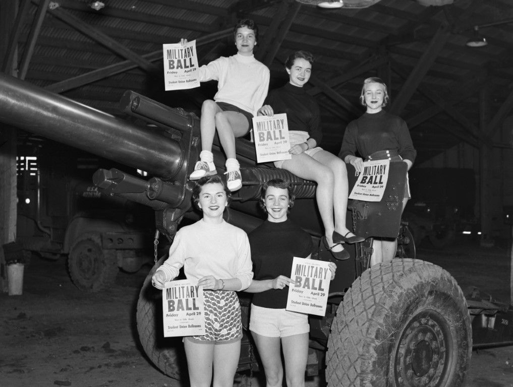 Five young women posing with flyers for a military ball on a military machine.