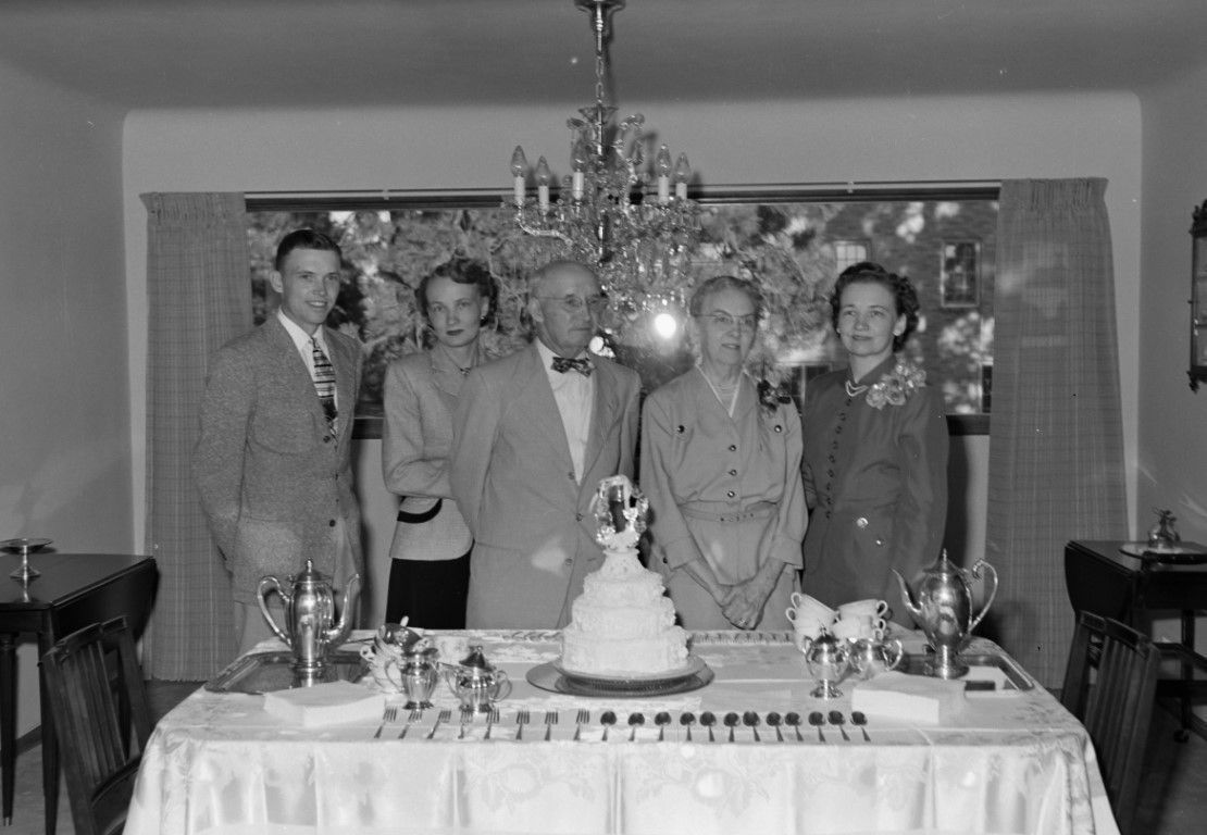Five people pose for a photo behind a dining table set with tea services, a three-tier cake, and assorted forks and spoons - possibly Rachel Jones' parents and sibling(s). At Bill & Rachel Jones' 25th Anniversary party, 1951. Rachel Jones at right.