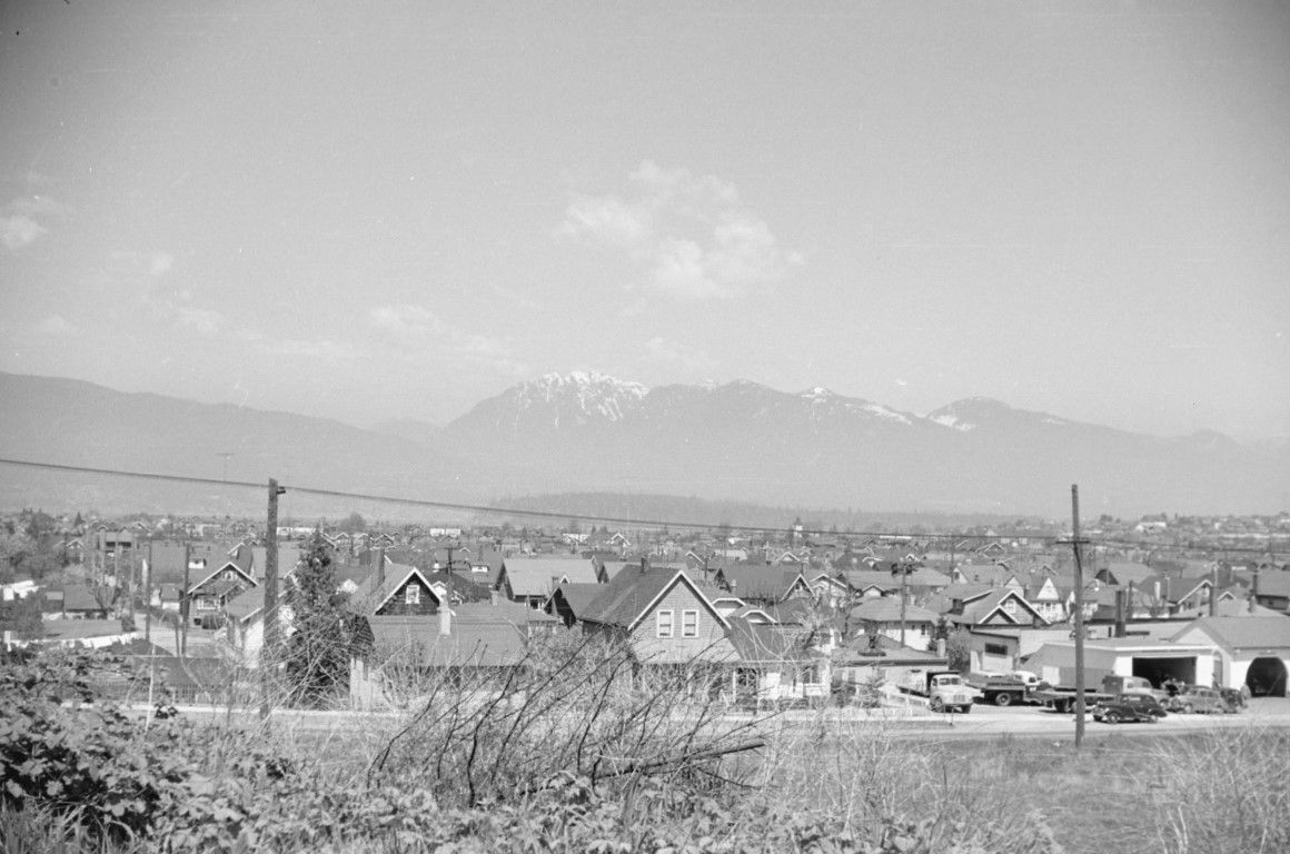 Houses, cars and trucks in a Moscow neighborhood with Moscow Mountain in the background.