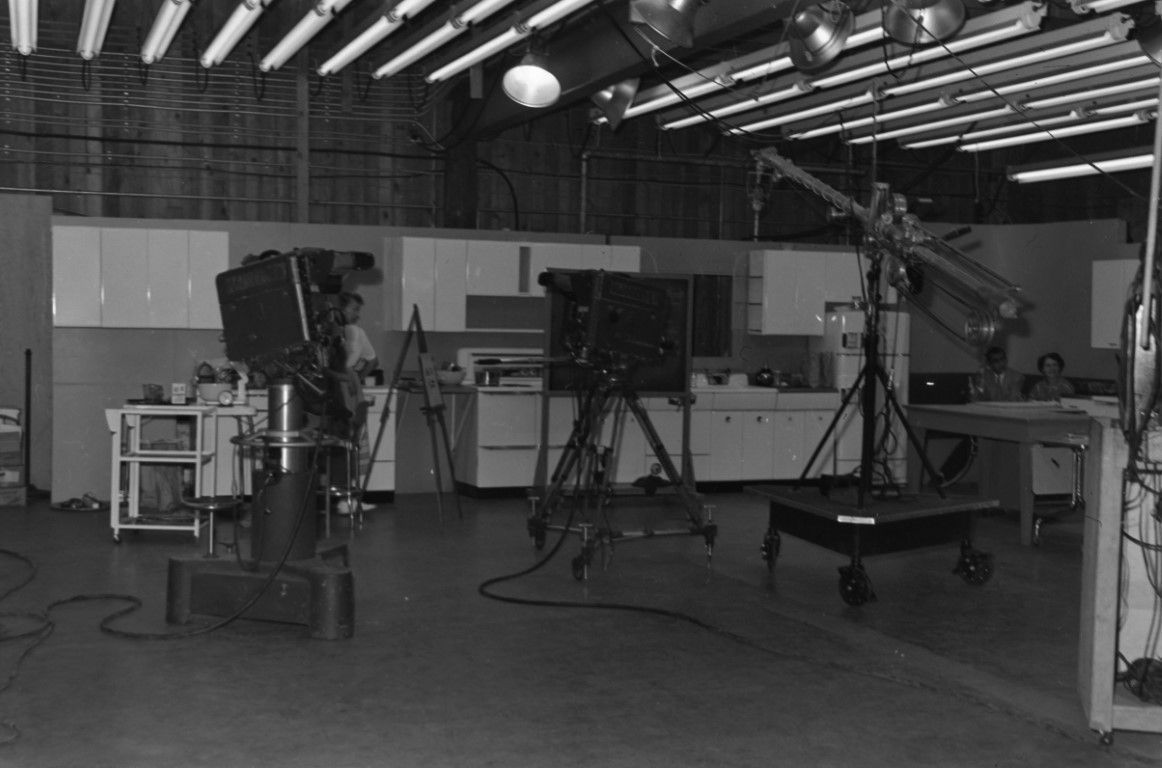 Cameras and various equipment arranged around a television studio.
