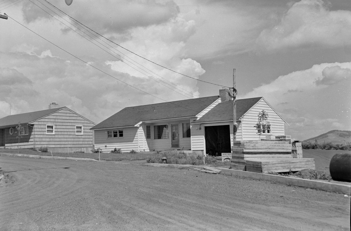 A home under construction at 1448 Borah Ave, a sign in front says "Being Built by Talbott". Tomer Butte in the background distance at right. Talbott Brothers, Curtis, Loyal and John operated a construction and cabinet business in the early 50's. They built severa homes in the University Heights neighborhood.