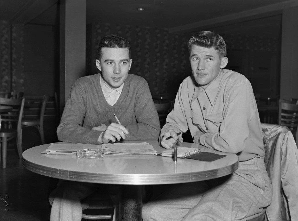 Two male students reviewing notes in a cafeteria or restuarant.