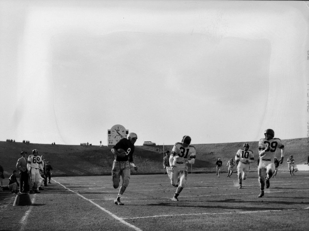 A football player is running down the sideline with the ball with defenders and an official in pursuit. An old-style scoreboard and vintage car are in the background. Neal Stadium U of I