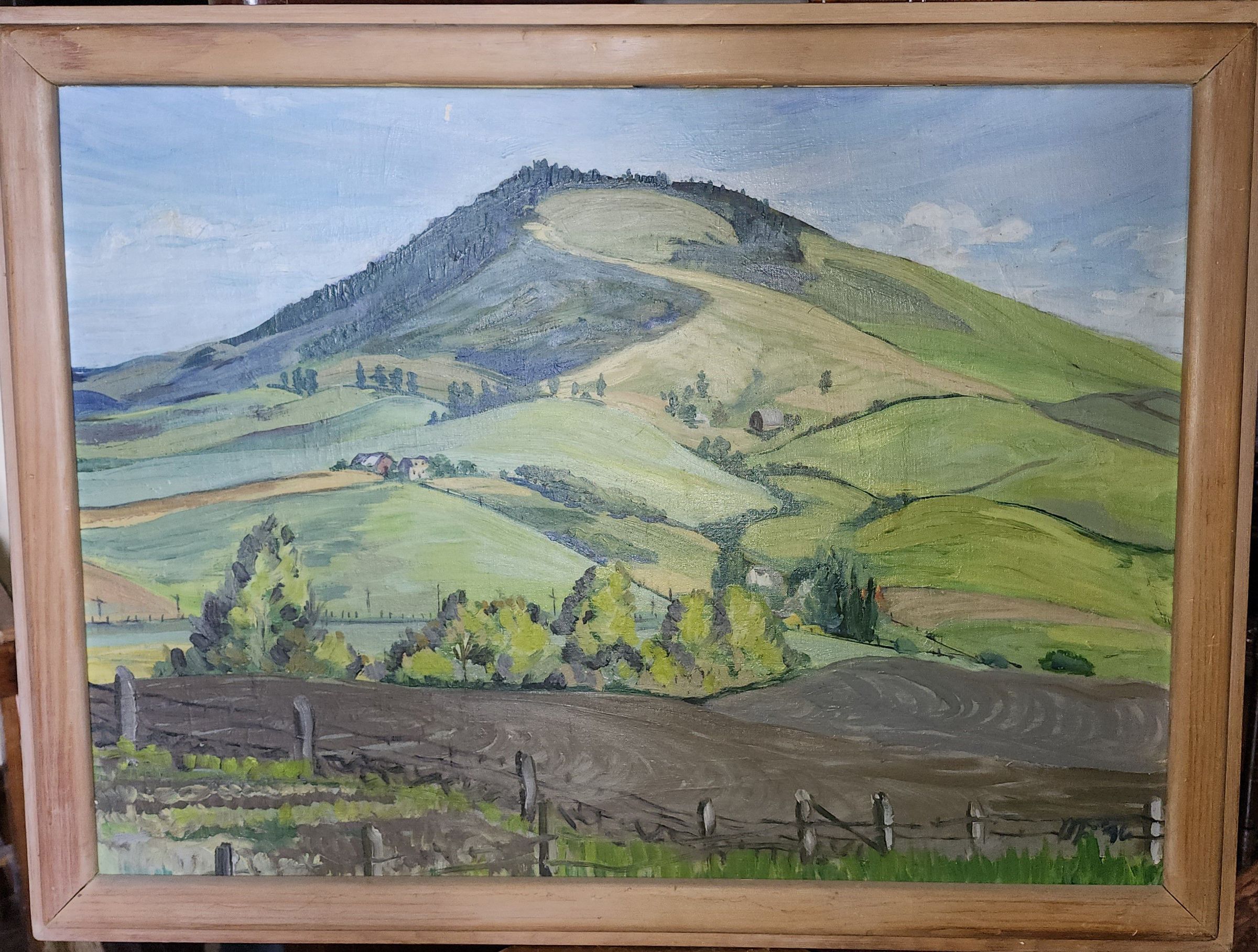 Probably Tomer's Butte; primarily green with barns and farms nestled in the lower hills, fencerow in the lower front, framed in medium brown wood. A hand written note attached identifies the painting as a Marian Featherstone, painted June 1946- June 1947. This was on a piece of brown paper backing attached.Made/Created
