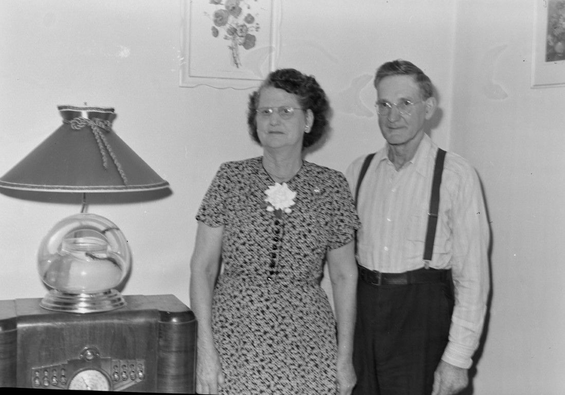 A older woman and man standing next to a radio with a lamp on top (same couple as 1290)