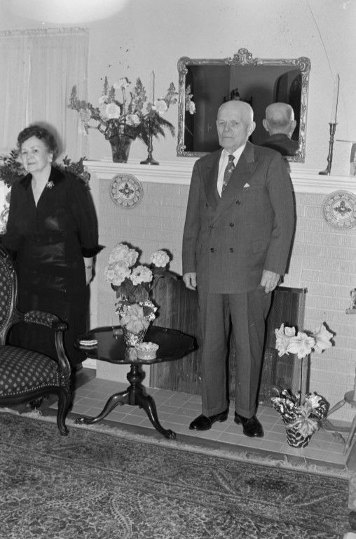 A woman and a man dressed formally, standing in front of a fireplace with multiple flower arrangements around