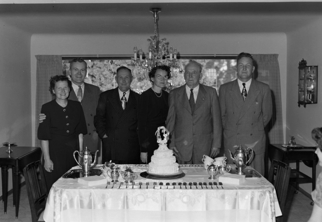 Six people pose for a photo behind a dining table set with tea services, a three-tier cake, and assorted forks and spoons. Left to right: Ann Jones, Edyrn Jones, Bill Jones, Josephine Jones, Hugh R Jones, Sam Jones. At Bill & Rachel Jones' 25th Anniversary party, 1951.