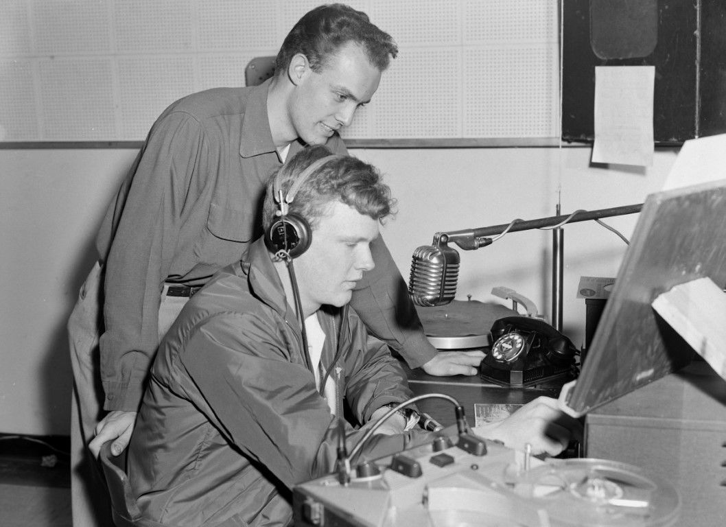 Two men in a recording studio, one wearing headphones and talking into a microphone, reel-to-reel tape deck in foreground, rotary phone and record player in background