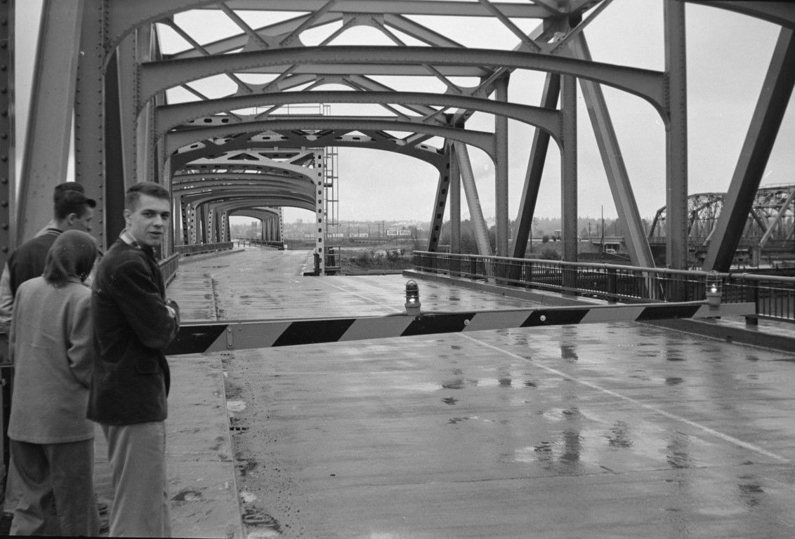 Four people standing on the sidewalk of a bridge next to the lowered crossing gate.