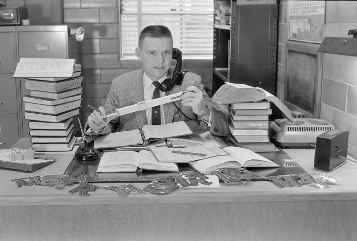 Bill Parish is seated at his desk, surrounded by books, and is talking on the telephone while holding a slide rule. A banner at the front of the desk spells "Merry Christmas."