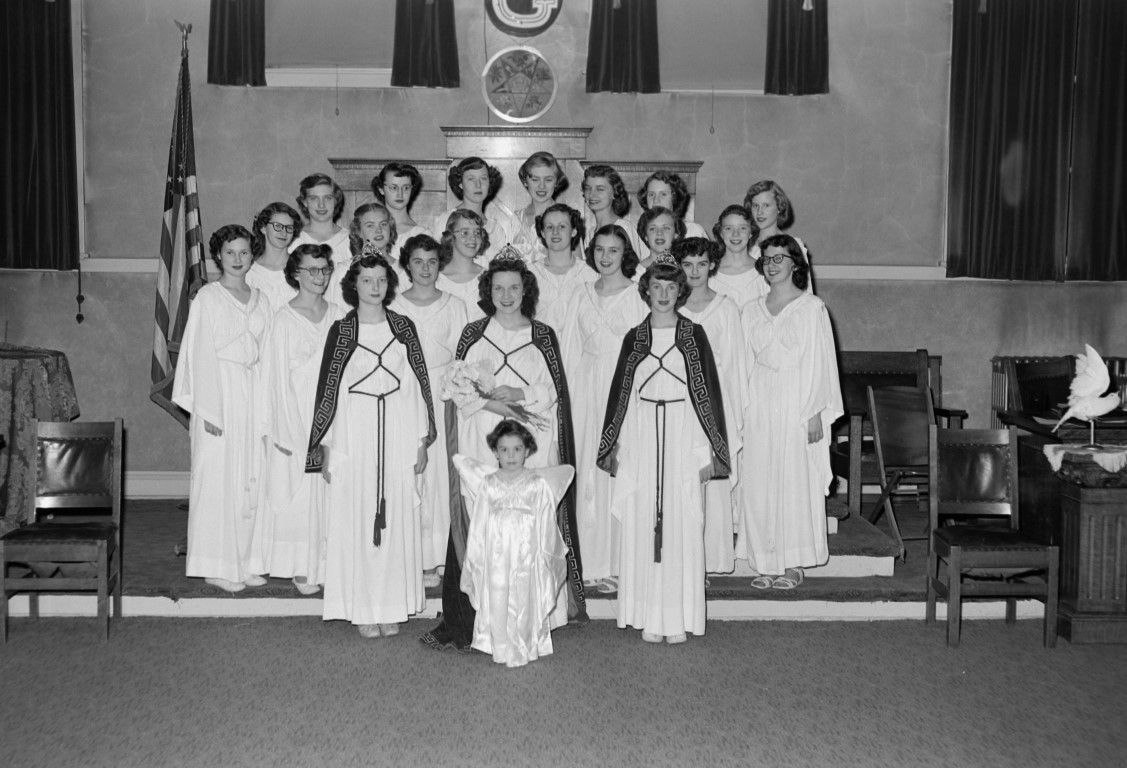 A large group of young women in matching white dresses, three women in front wearing crowns and capes, middle woman holding a bouquet of flowers, a little girl in white dress and wings stands in front. The Order of the Eastern Star symbol hangs on the wall behind them.