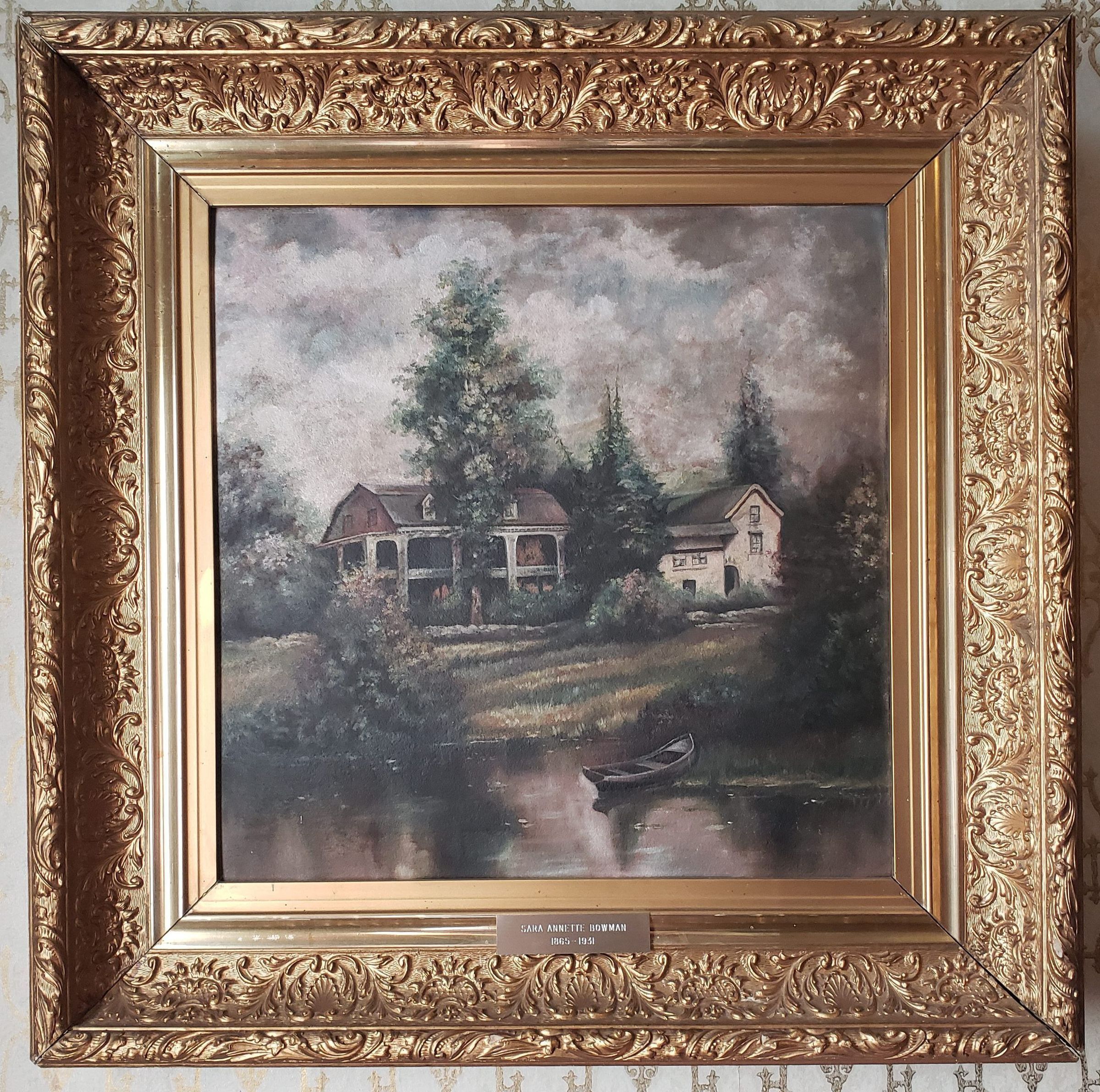 painting by Sara Annette Bowman, the first art teacher at the U of I. Painting is of a house and lake and surrounding foliage.