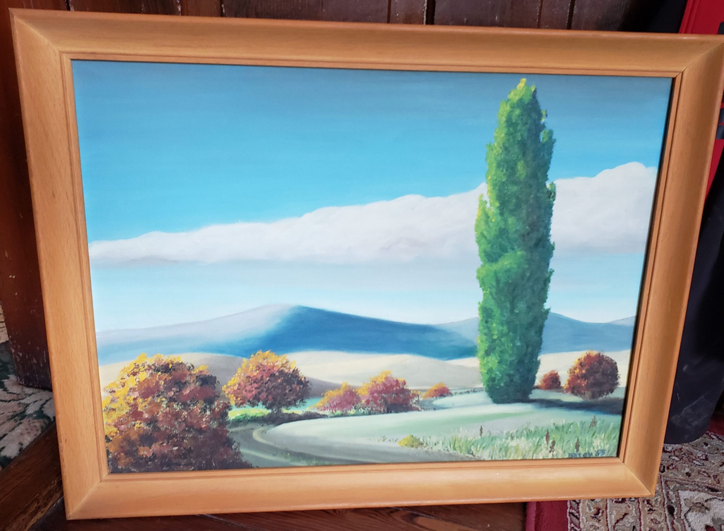 Original oil painting on canvas by Don Batey; landscape of Moscow Mountain, shrubs and bushes by road; natural wood frame; Signature: Batey 63