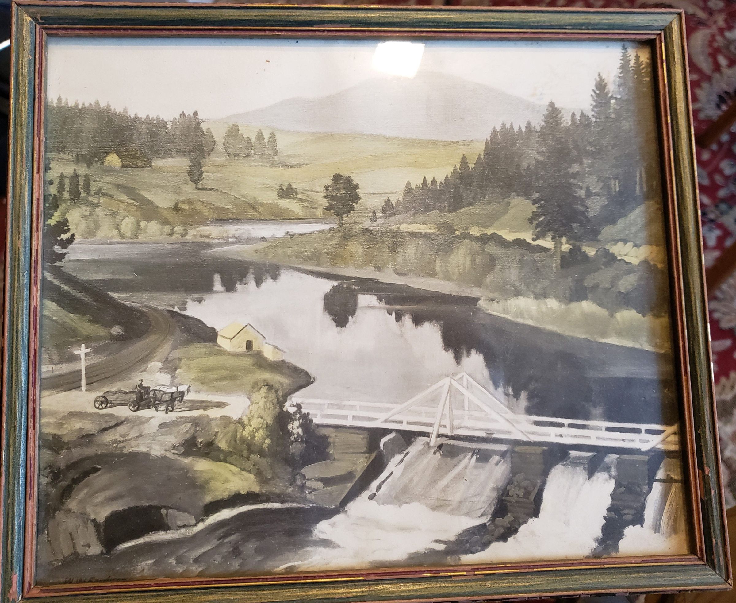 Framed painting; oil painting of Potlatch with bridges, river and mountain in background, signed W.W. Ferguson. Green and gray coloring; glass and wood frame; 10" x 8 1/2"
