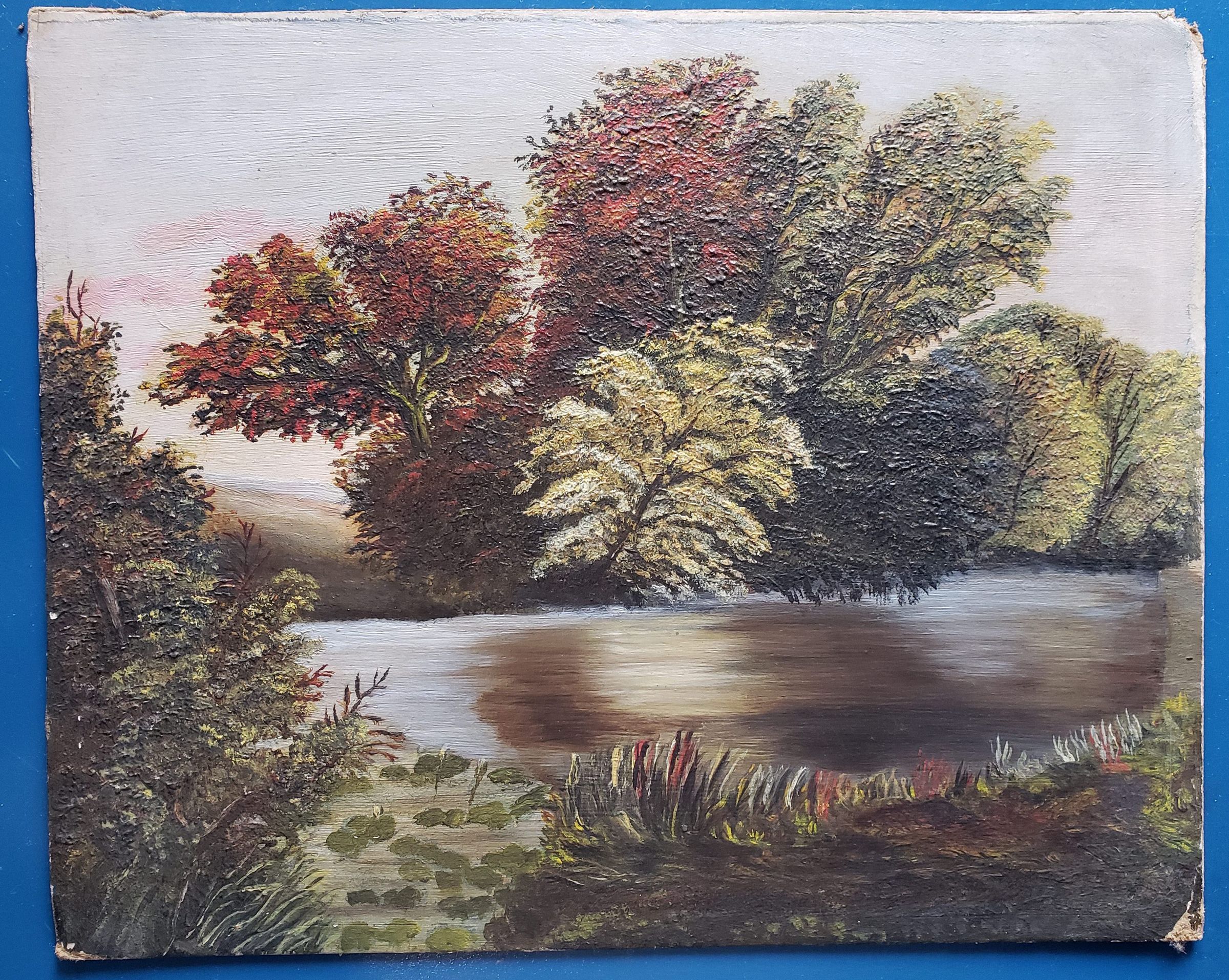 oil painting; 9" x 8"; agrove of trees and river