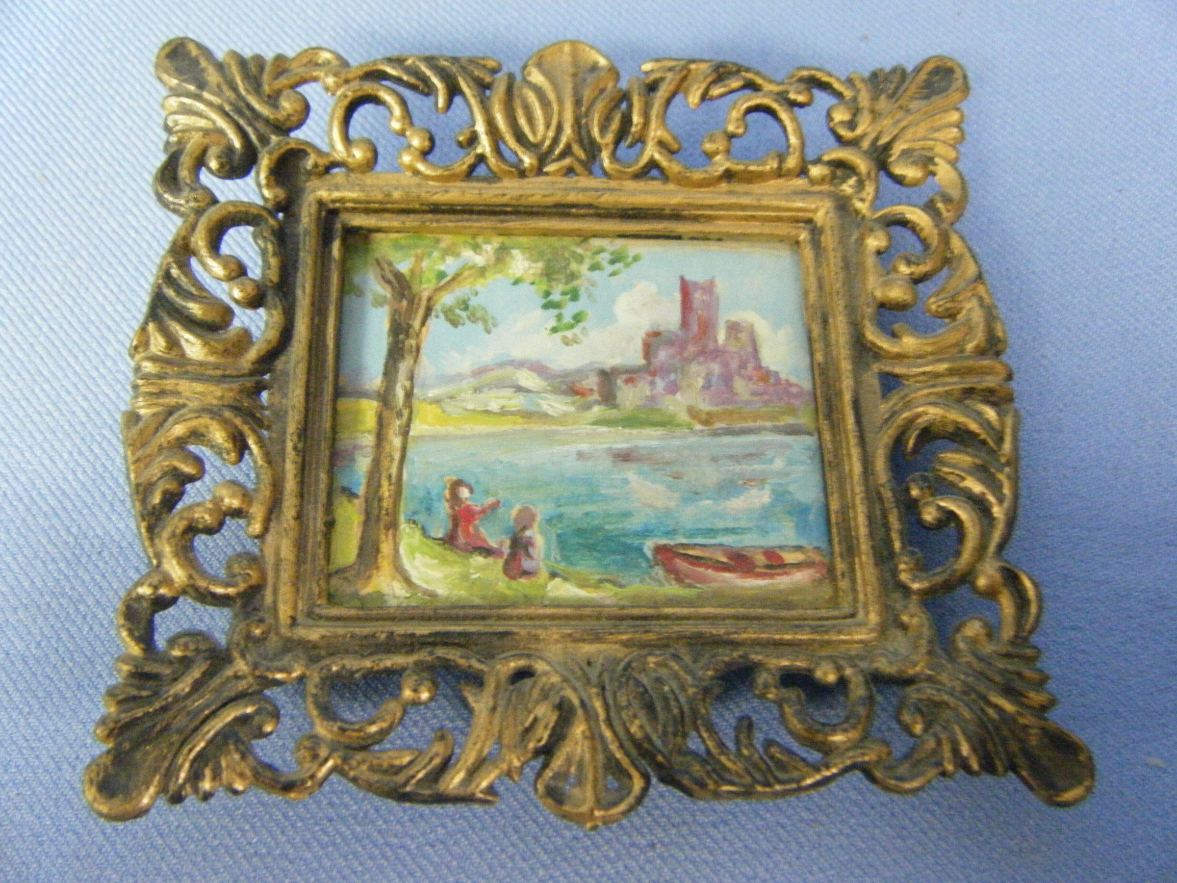 black plastic frame, painted gold on the front; painting is on cardboard; it is held in the frame by a black plastic panel; painting is of two people sitting on a lake, a boat and a tree are nearby, off in the distance is a castle and some mountains