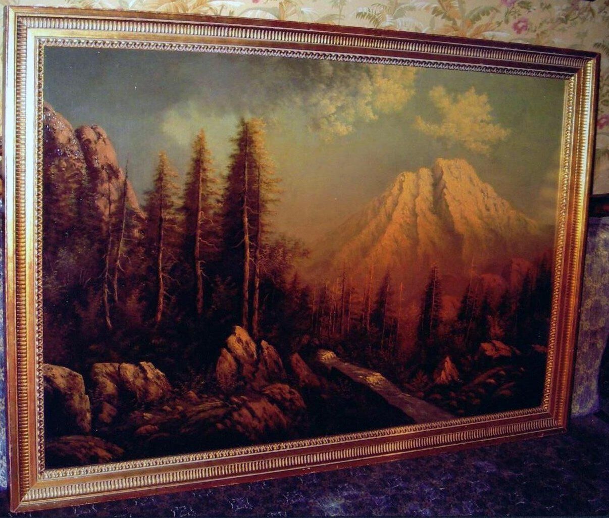 oil painting by Eliza Barchus; framed; scene of Mt. Shasta and surrounding forest, rocks, stream