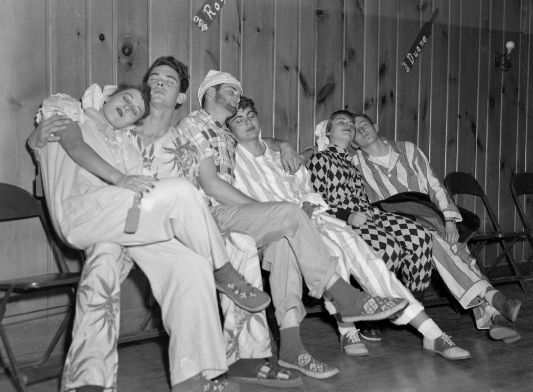 A group of students in costumes pretending to be asleep on one another. Behind them on the wall are greek paddles with names.
