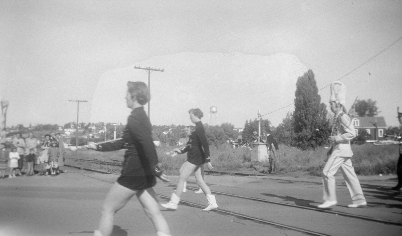 Three majorettes and a marching band leader in a Homecoming parade, crossing railroad tracks embedded in the street, 3rd or 6th Street in Moscow. A small watches from the edge of the street. The water tower Almon Asbury Lieuallen Park is visible in the background.